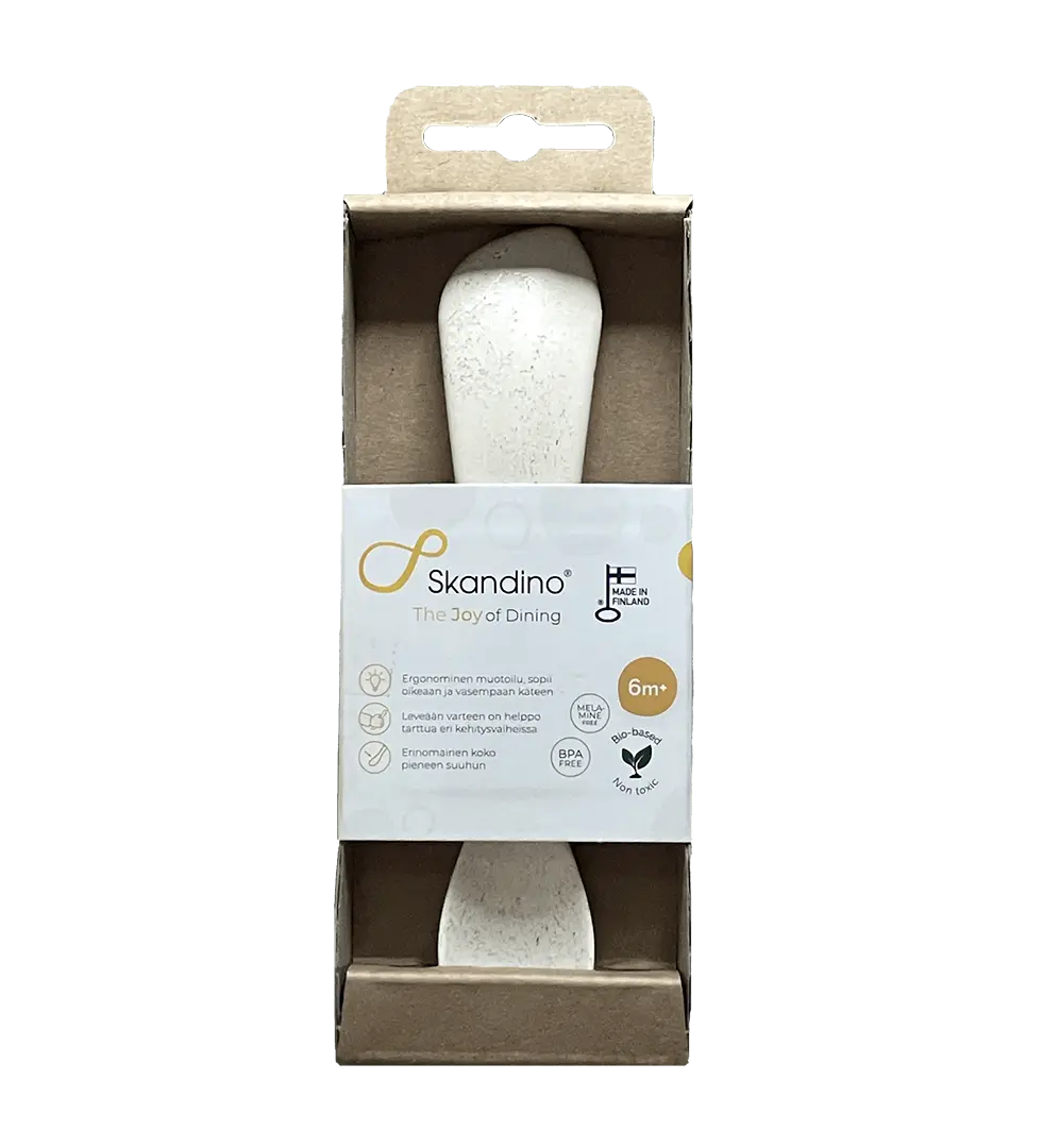 The Skandino Spoon is a safe, toxin-free first spoon made in Finland. It's "coning" handle design allows for a 1-year-olds' fist grip 👊, but encourages to quickly learn the ✍️ pen grip.